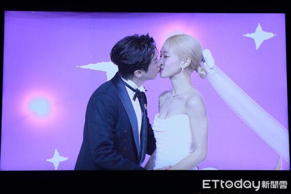 随后两人于阶梯前进行交手仪式,LULU 先后拥抱爸爸与妈妈,父母亲亲手将爱女托付给陈汉典,两人随即向双方爸妈鞠躬致谢,场面感人,温馨满满;随后这对幸福洋溢的新人进行誓词交换仪式,只见两人在证婚人吴宗宪幽默的致词见证下,两人面对面许下承诺,并深情拥吻,全场笑声、掌声不断,为这段充满祝福与感动的流程画下最甜蜜句点。